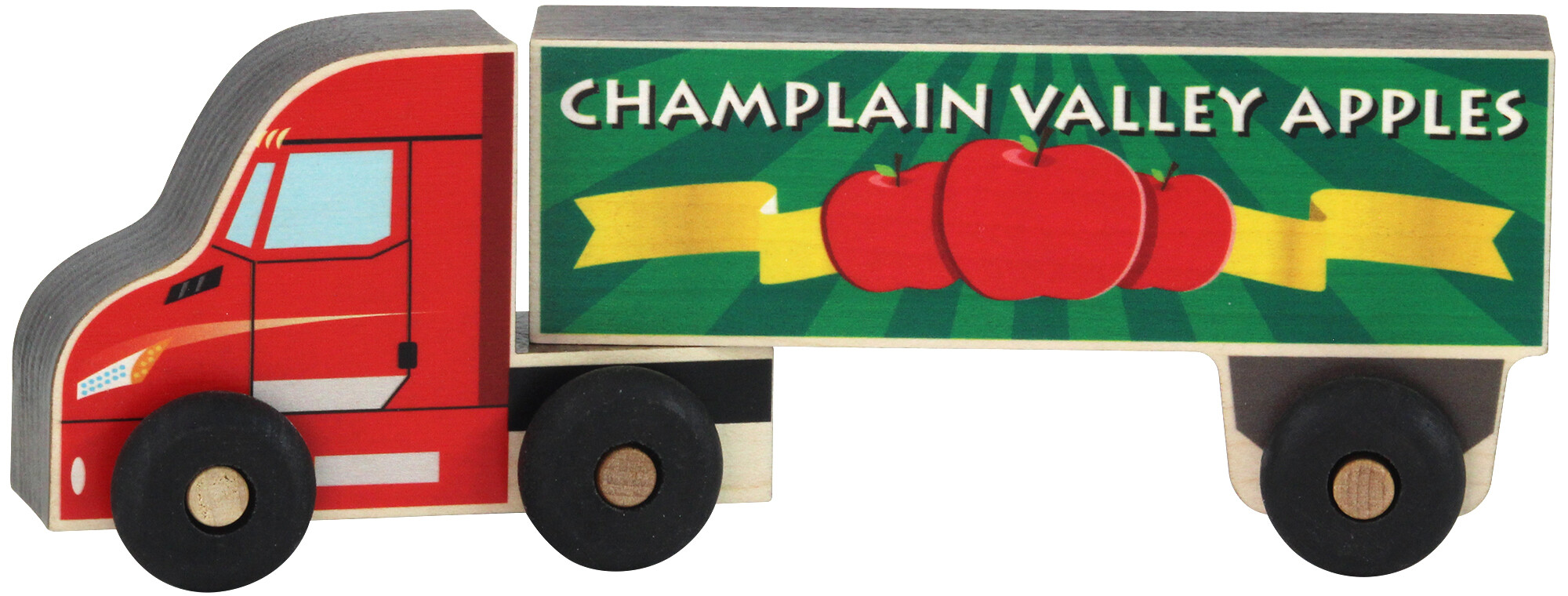Our Apple Semi Truck trailer can detach from the truck cab. Colorfully printed with non-toxic ink on locally sourced, sustainably harvested maple with hardwood wheels, the Semi measures approximately 8" long by 2.7" high. Built to the same scale as our Scoot vehicles, wooden Semi Trucks are well suited to younger children's small hands. Our Semi Trucks are cut using a laser. The brown edges of this product are a natural result of the laser cutting process.