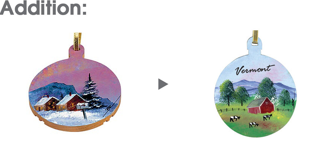 Handpainted Ball Ornaments by Luthera Rainville feature rural landscape scenes in various seasons. No two are alike. Ball Ornament measures approximately 2.75" diameter by 0.25" thick and is crafted from locally sourced, responsibly harvested maple hardwood. Back of ornament features a relief pattern. Specify theme/season in note box. Please allow extra time for delivery.