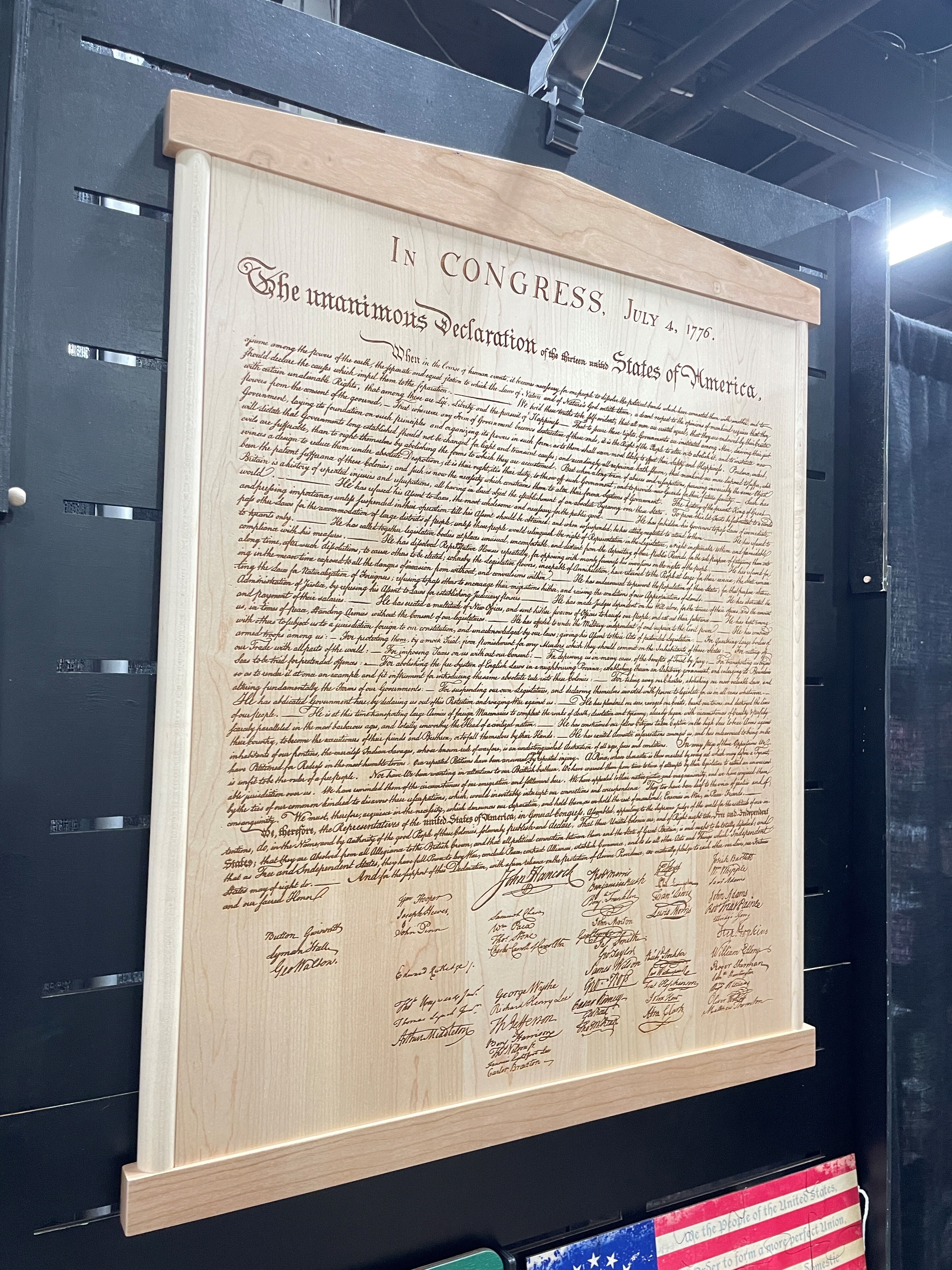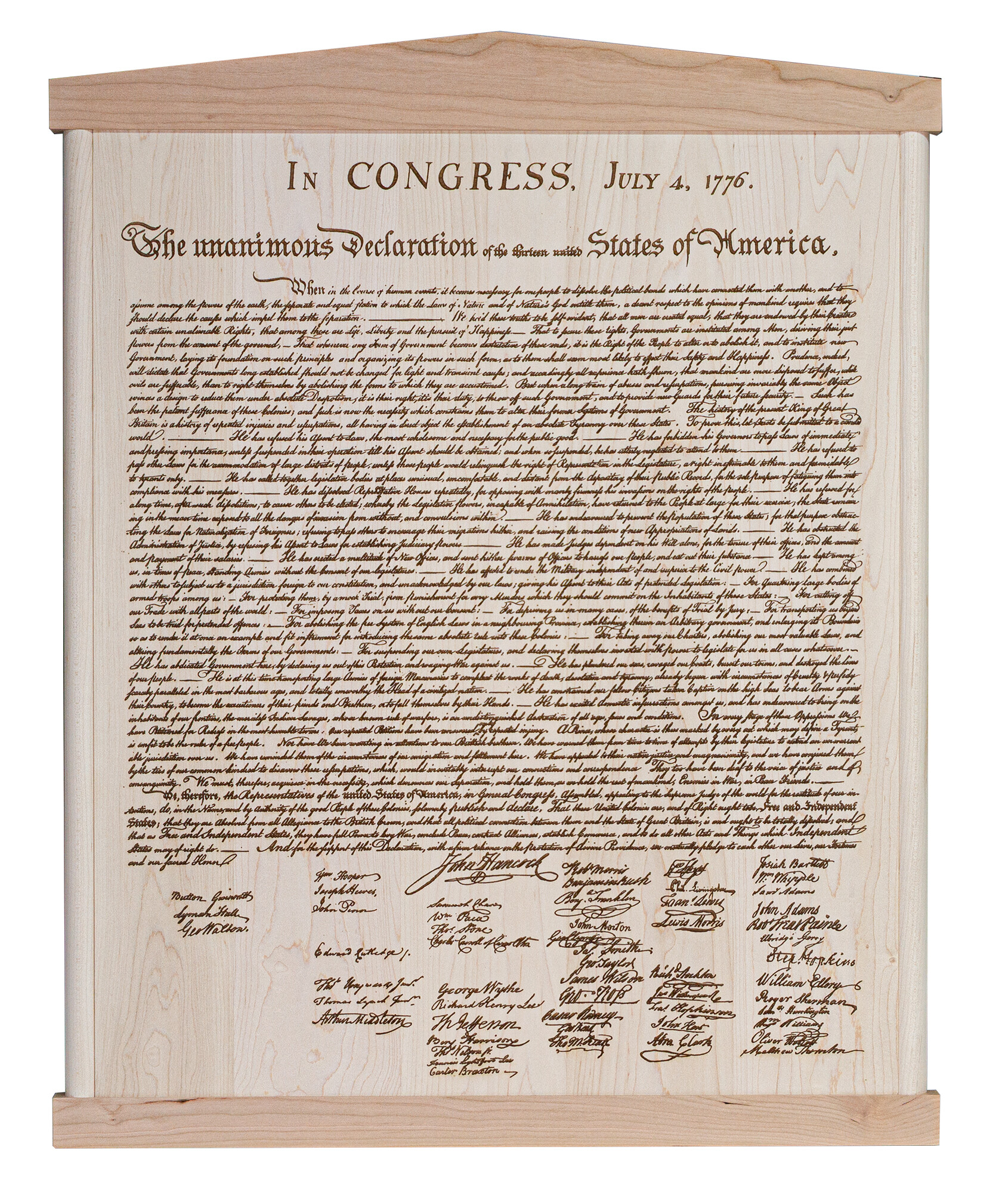 Calling all history buffs! Love the American Revolution and want a standout piece of art for your home or office? Our Declaration of Independence is the piece for you! Crafted from locally sourced and sustainably harvested hardwood maple and features a handmade hardwood cherry frame. The Declaration measures 30" tall by 23.25" wide by .75" thick and has two keyhole slots for hanging on the back.