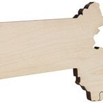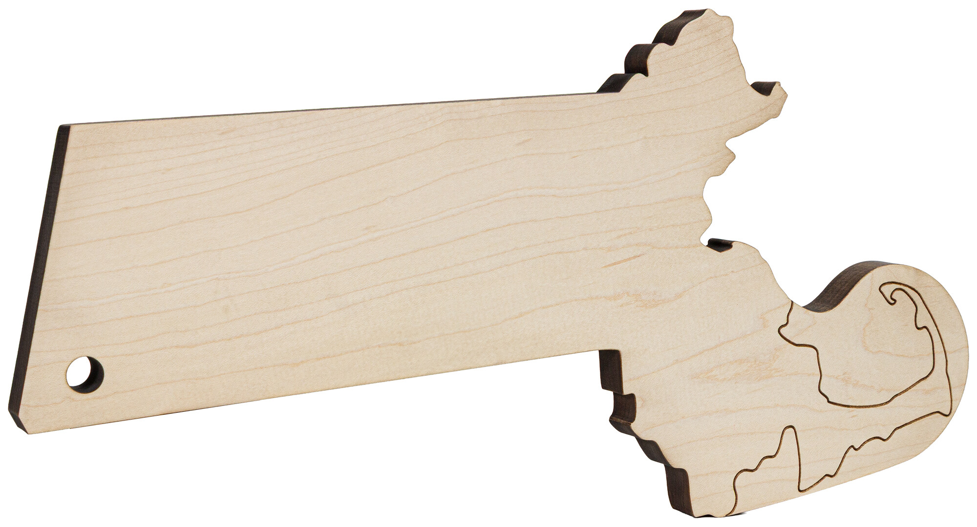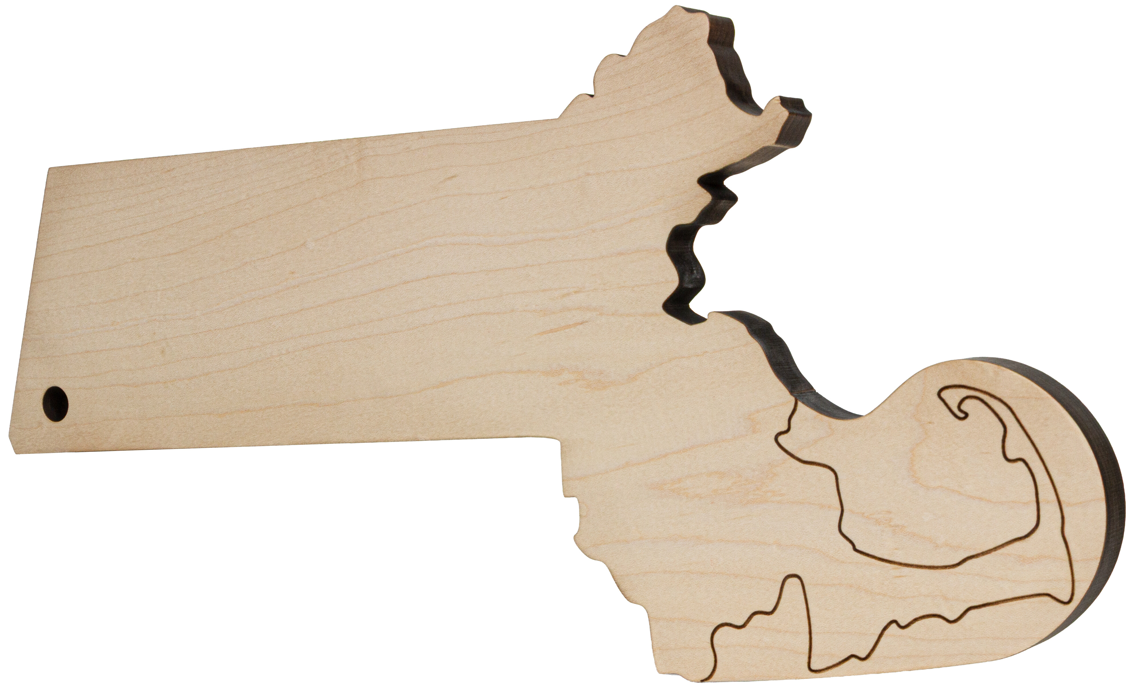 Our 16.5" long by 4" wide by 0.75" thick (8" wide at widest part) maple cutting board is a fun way to set a table. The Massachusetts shaped board has a hole for hanging in the southwestern corner. Crafted from locally sourced, sustainably harvested maple hardwood.