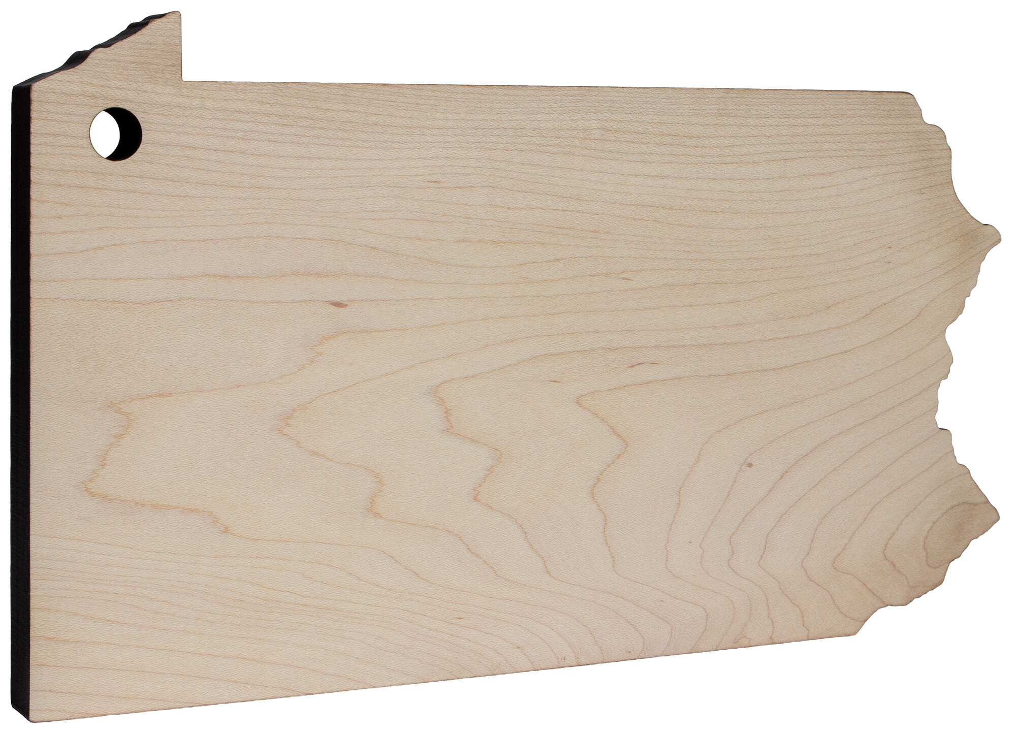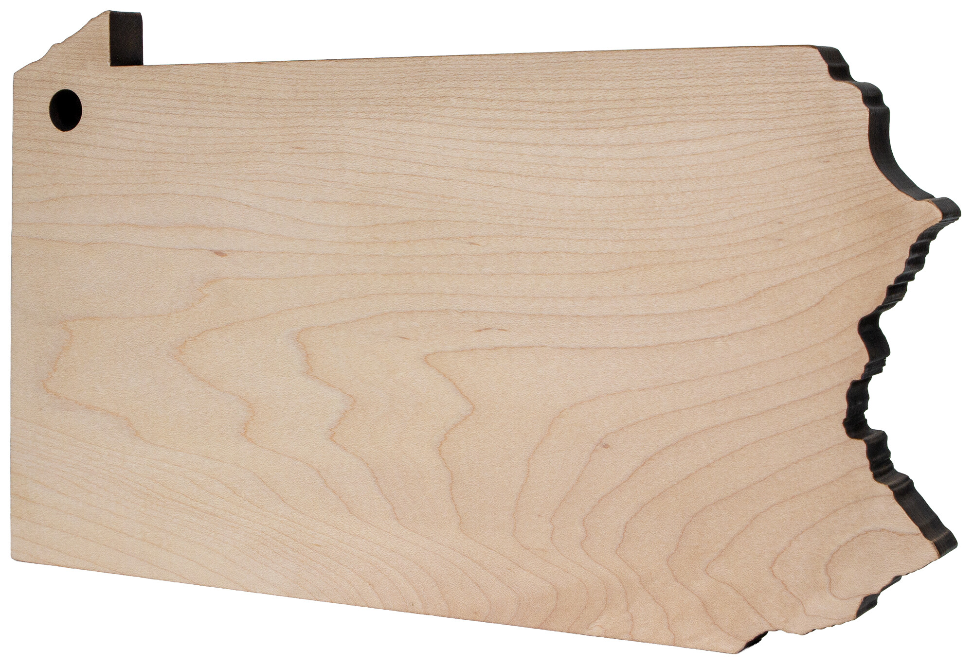 Our 12" long by 7" wide by 0.75" thick maple cutting board is a fun way to set a table. The Pennsylvania shaped board has a hole for hanging in the northwestern corner. Crafted from locally sourced, sustainably harvested maple hardwood.