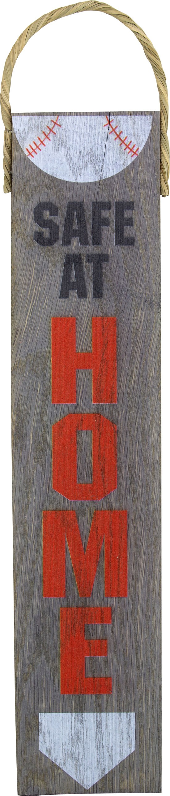 Giving new life to old wooden shipping pallets! Measuring approx. 3" wide and 14" tall, this sign adds a beautiful rustic flair to the home or office. Printed with a colorful Safe At Home graphic, finished for a faux-weathered aesthetic and hung with a loop of rope.