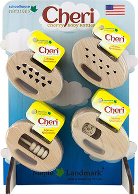 Cheri Rattles Display Rattle display attractively displays three each of our four rattle designs. It is 12" wide x 16" high x 7" deep. Comes with two removable feet.