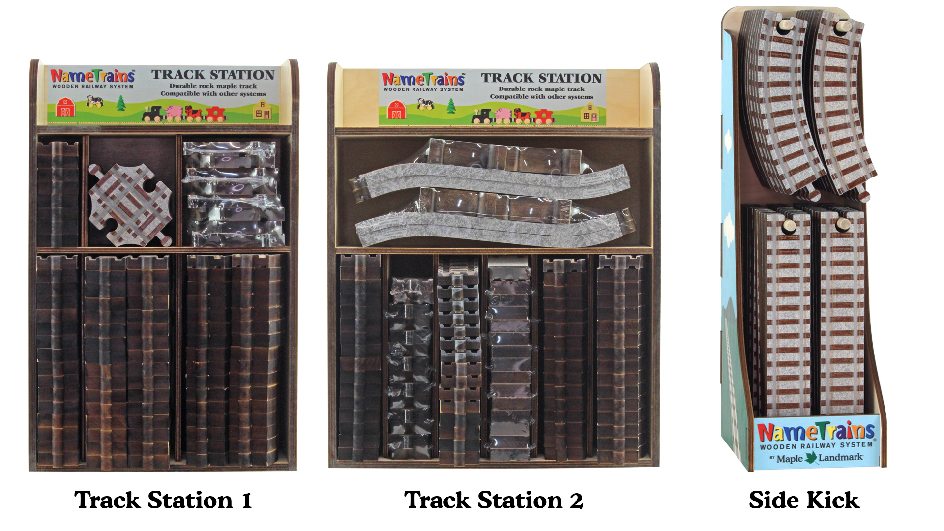 NameTrains® Track Displays Our Track Station Displays I & II and Side Kick Display can sit alongside your main unit. Station I has slots for the six most standard track segments. Straights, curves, switches and crossovers. It measures 17.25" high x 11" wide x 7" deep. Station II has space for an additional seven designs—adapters, bridge set, puddlejumpers, wavy, ramps, small curves, and 2" straights. It is 17.25" high x 13.75" wide x 7" deep. With both, we include a laminated card that shows different track layouts to give you and your customers some idea about how many pieces they may need. Side Kick fits 32 8" Straight and 32 Large Curve track pieces. It measures 16.5" high x 5" wide x 7.25" deep. All displays are free with purchase of contents.
